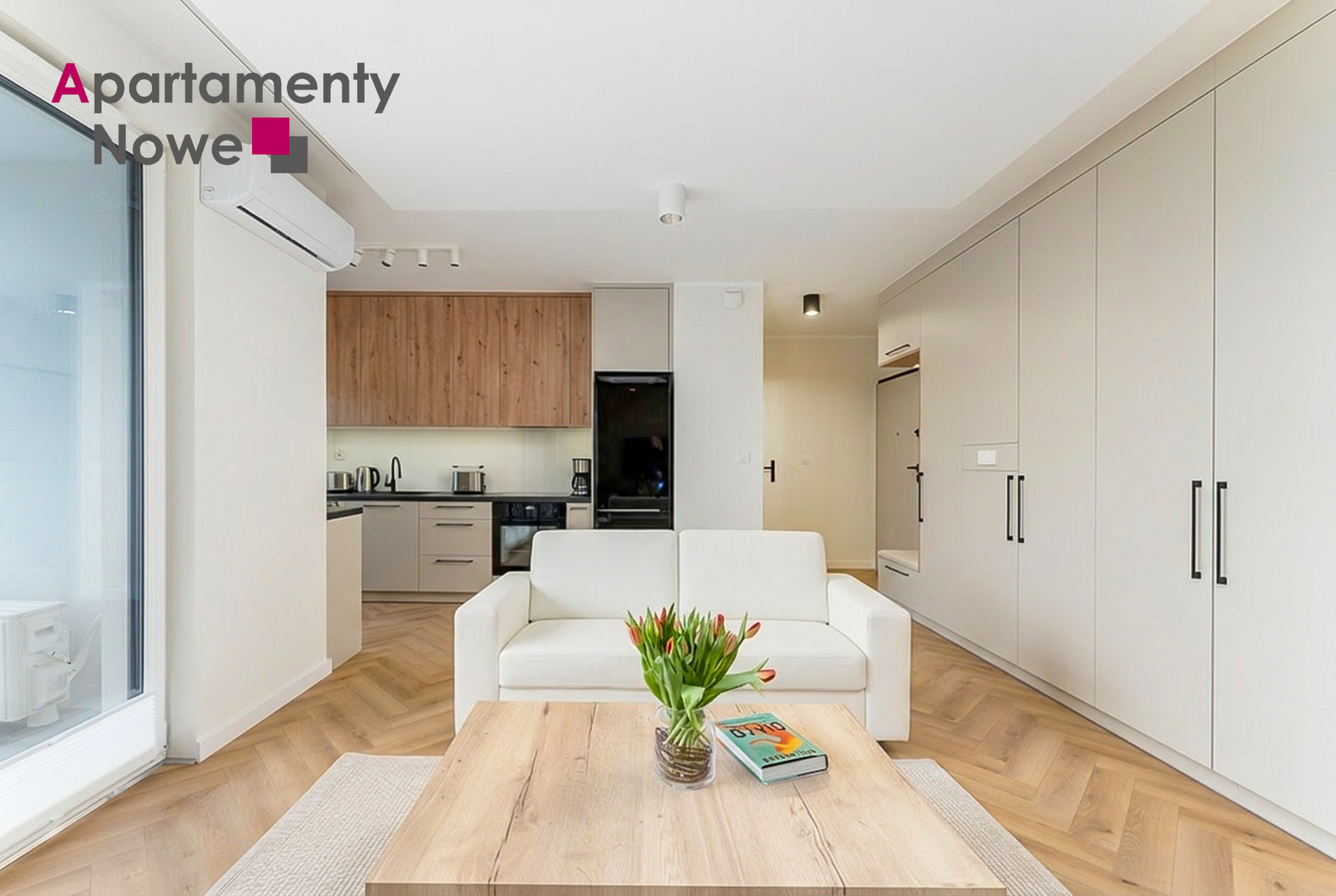 Mieszkanie usytuowane na 4 piętrze nowoczesnego kompleksu mieszkaniowego z 2025 roku. Mieszkanie ma powierzchnie 44 m2, na które składa się: jasny salon połączony z funkcjonalnym aneksem kuchennym z wyjściem na balkon, osobna, przytulna sypialnia, łazienka z prysznicem, przedpokój. Mieszkanie jest wyposażone w w klimatyzacje, pralko-suszarkę oraz wszystkie potrzebne rzeczy użytku codziennego. Do mieszkania przynależy miejsce postojowe w garażu podziemny (możliwość wynajęcia za dodatkową opłatę)
