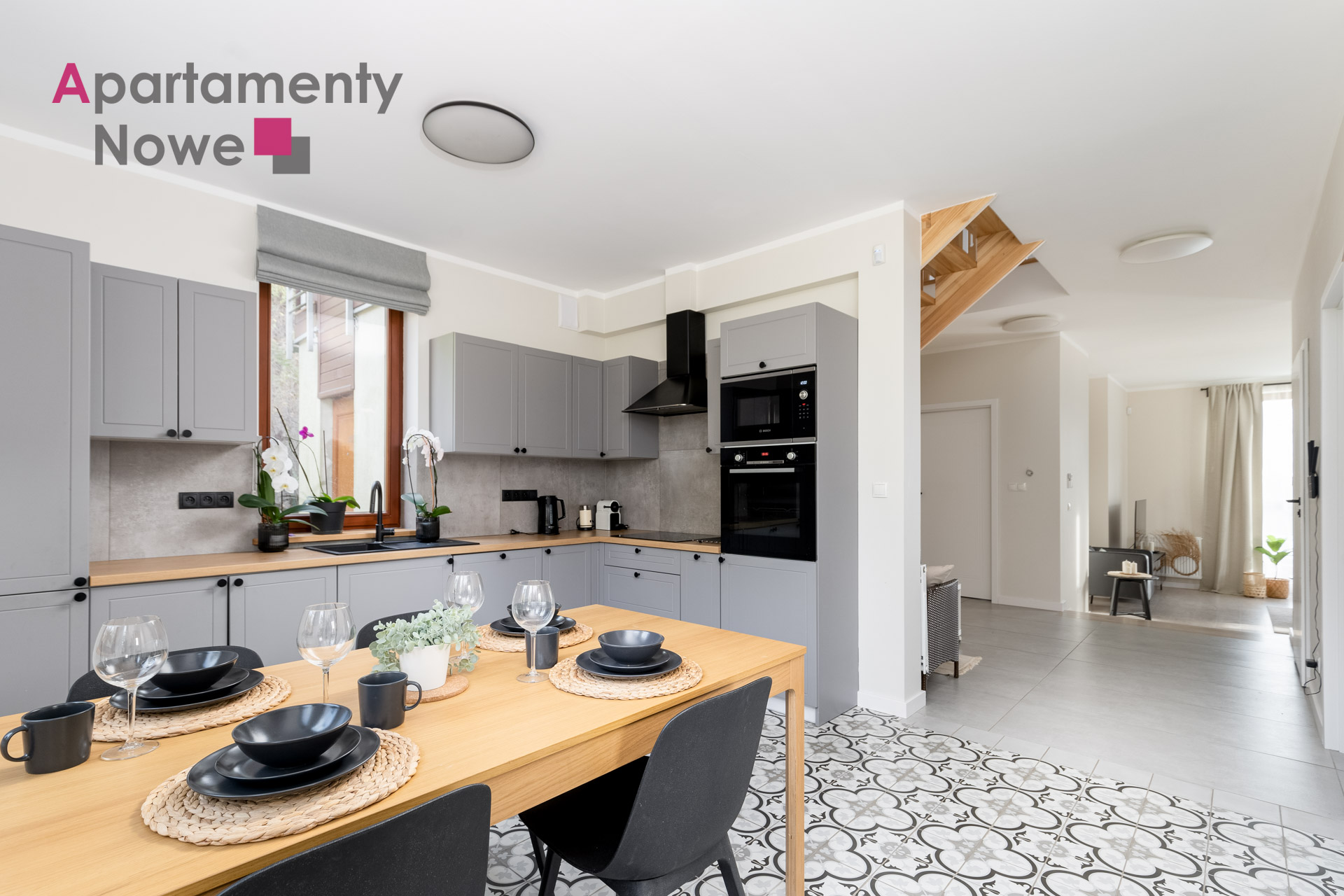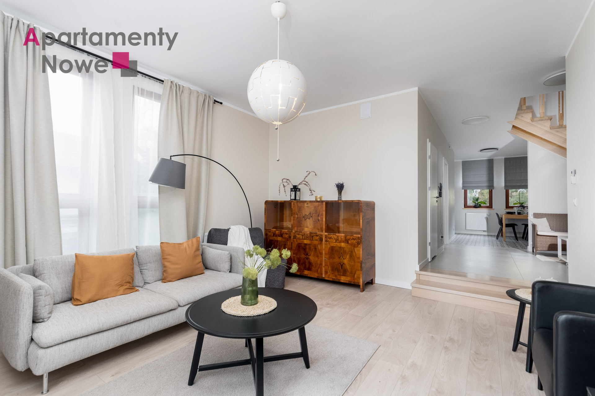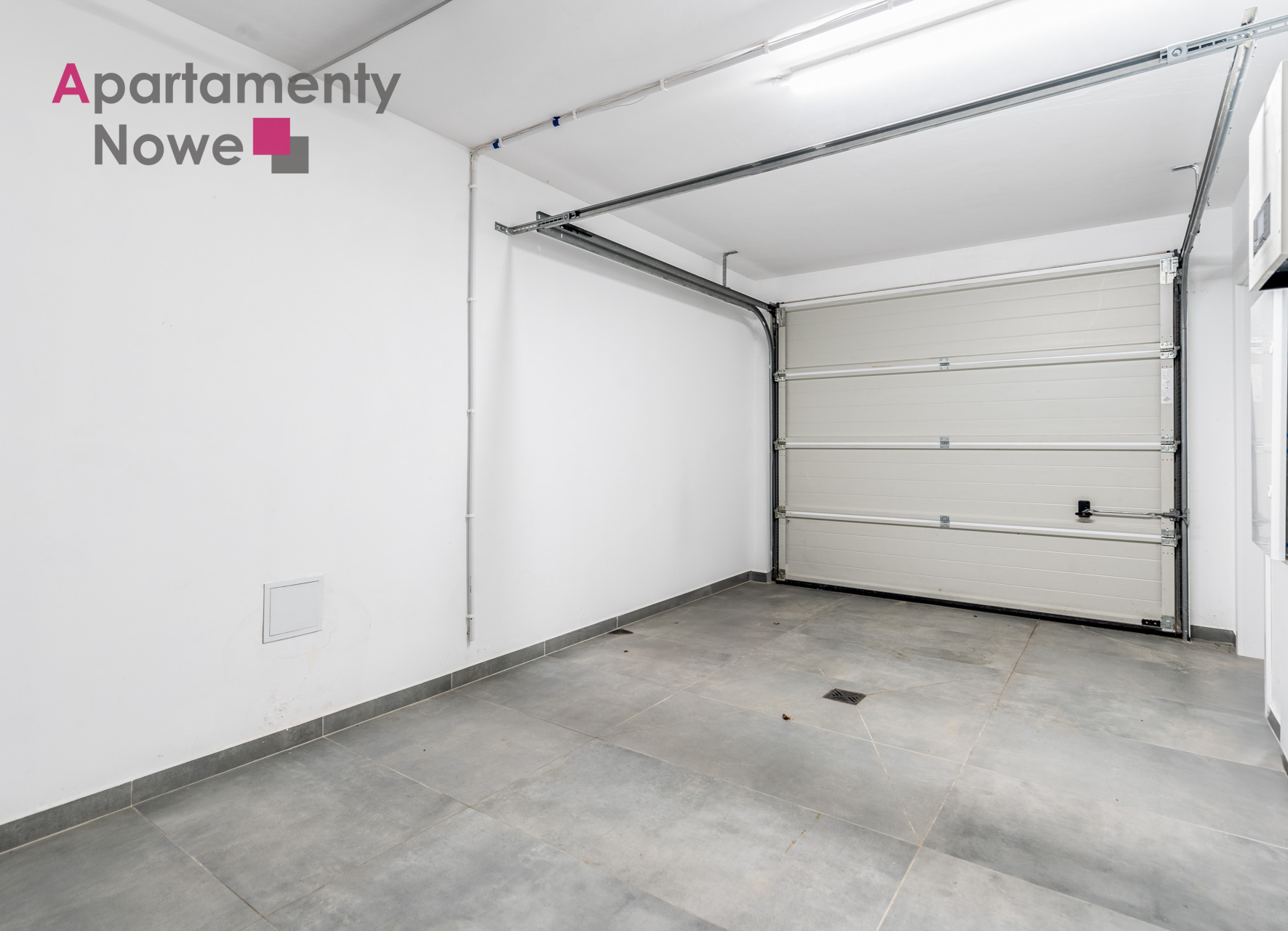 Jasny, przestronny salon z wyjściem na taras, funkcjonalna otwarta kuchnia z jadalnią, pokój gościnny (lub gabinet), łazienka (z prysznicem piecem gazowym, pralką),wiatrołap oraz garaż i pomieszczenie gospodarcze z wyjściem na ogród. Duże okienne przeszklenia powodują, że ogród i salon przenikają się wzajemnie.