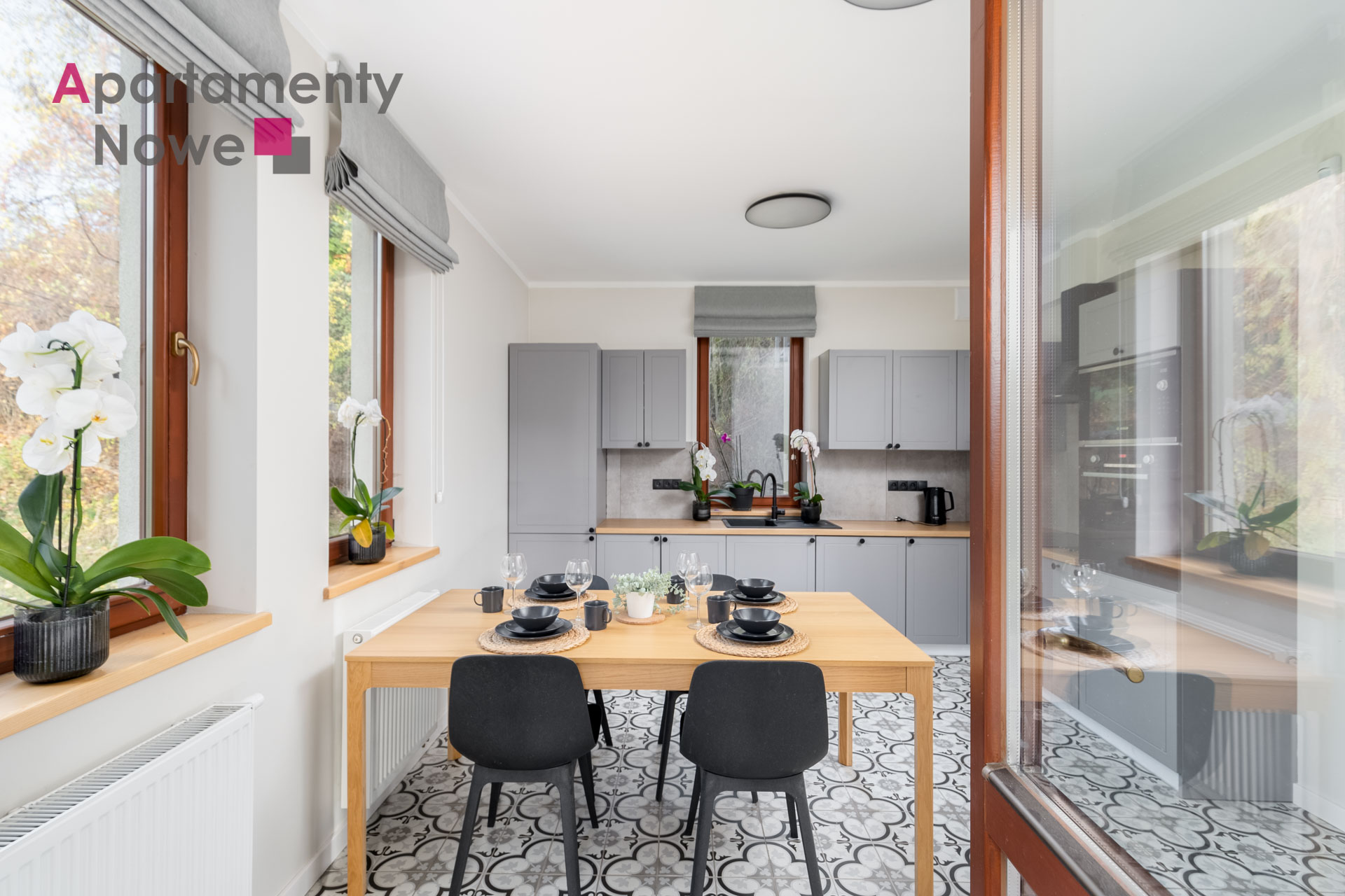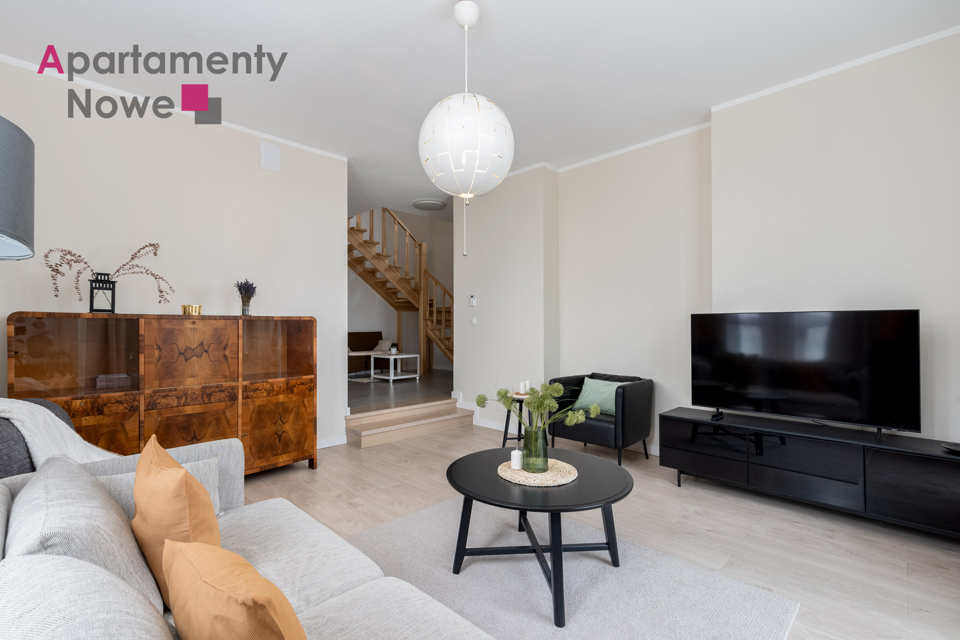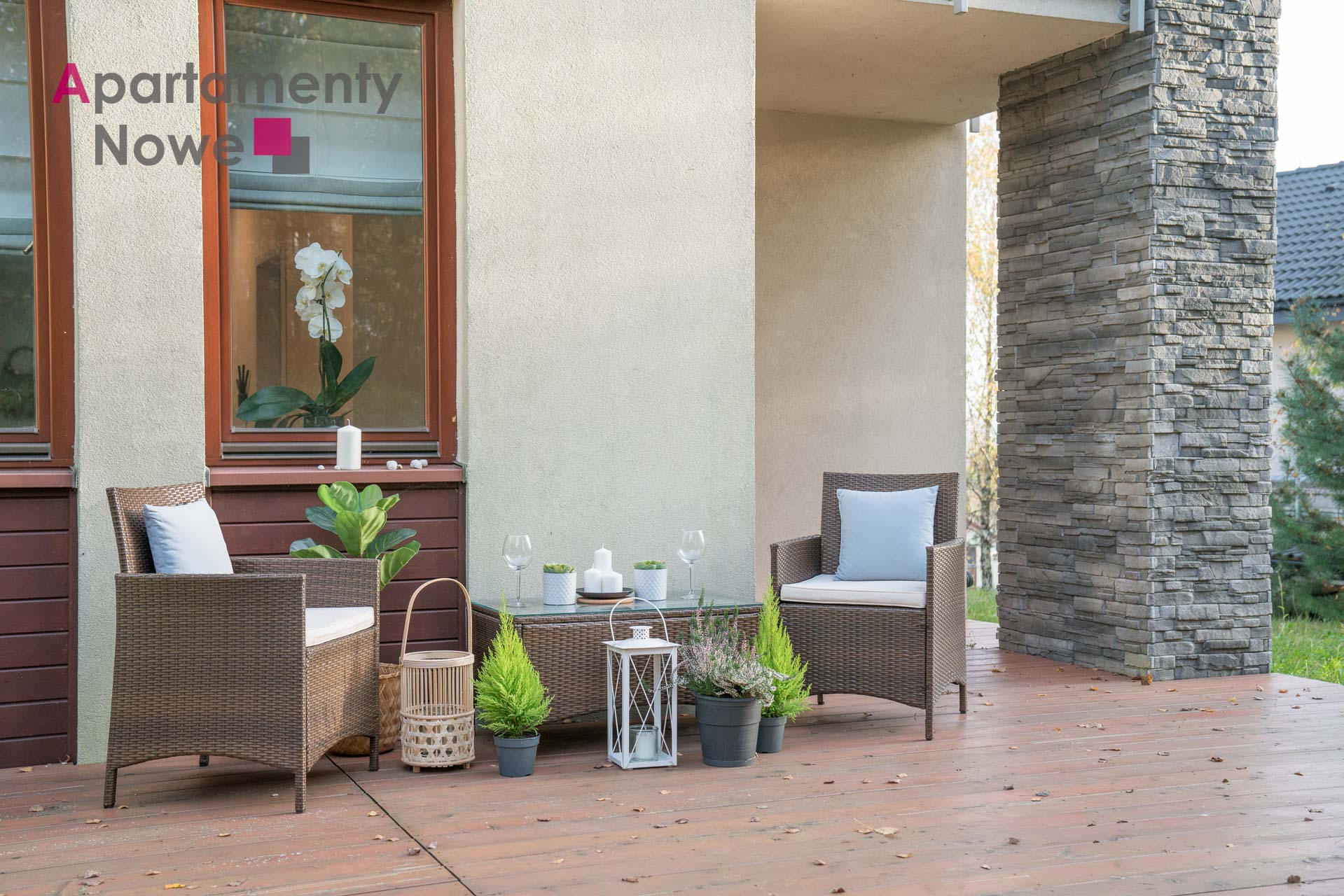 Jasny, przestronny salon z wyjściem na taras, funkcjonalna otwarta kuchnia z jadalnią, pokój gościnny (lub gabinet), łazienka (z prysznicem piecem gazowym, pralką),wiatrołap oraz garaż i pomieszczenie gospodarcze z wyjściem na ogród. Duże okienne przeszklenia powodują, że ogród i salon przenikają się wzajemnie.