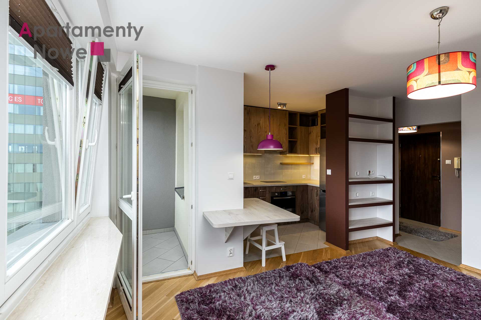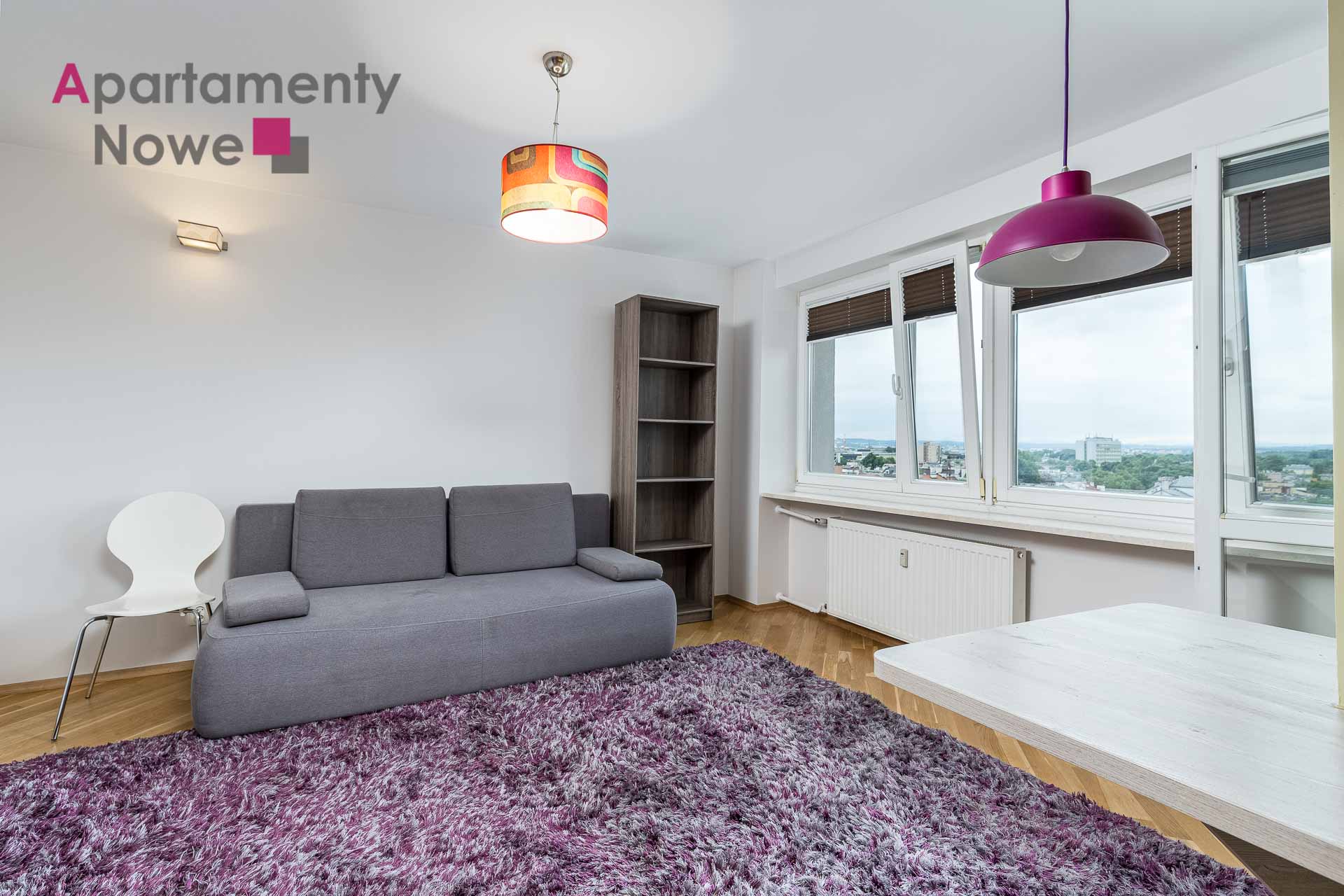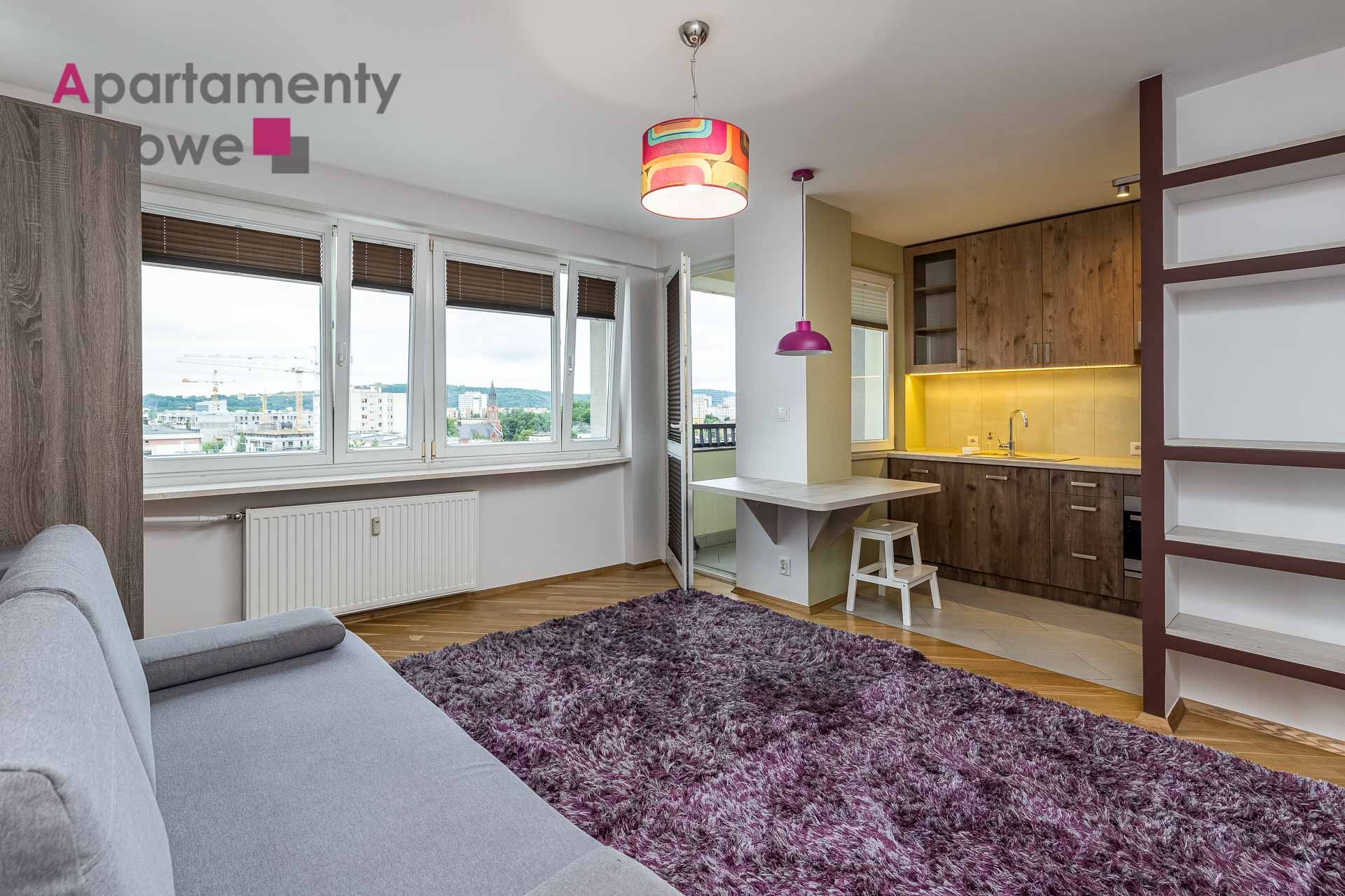 The apartment is located on the 8th floor of a modern and cozy building, it has an area of 30 sqm. The apartment consists of living room with kitchen, a bathroom with bathtub and toilet, hallway and loggia with a beautiful view of Krakow. The apartment is completely furnished and equipped with all necessary appliances.