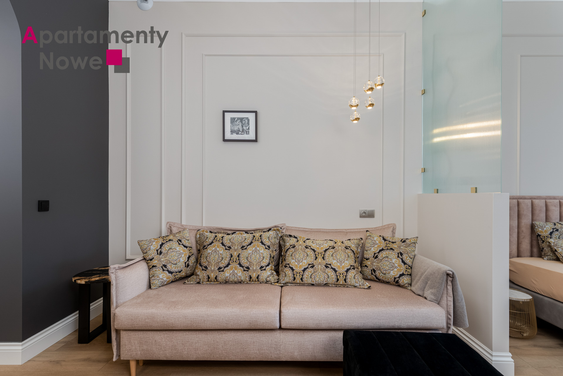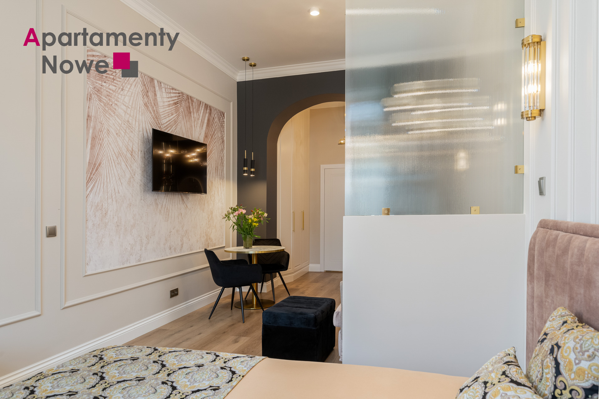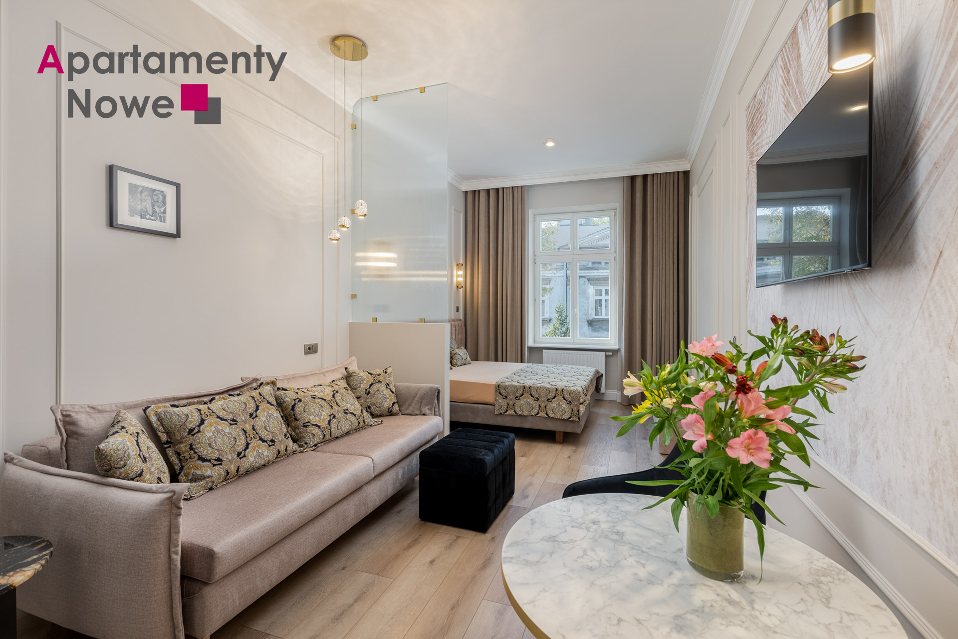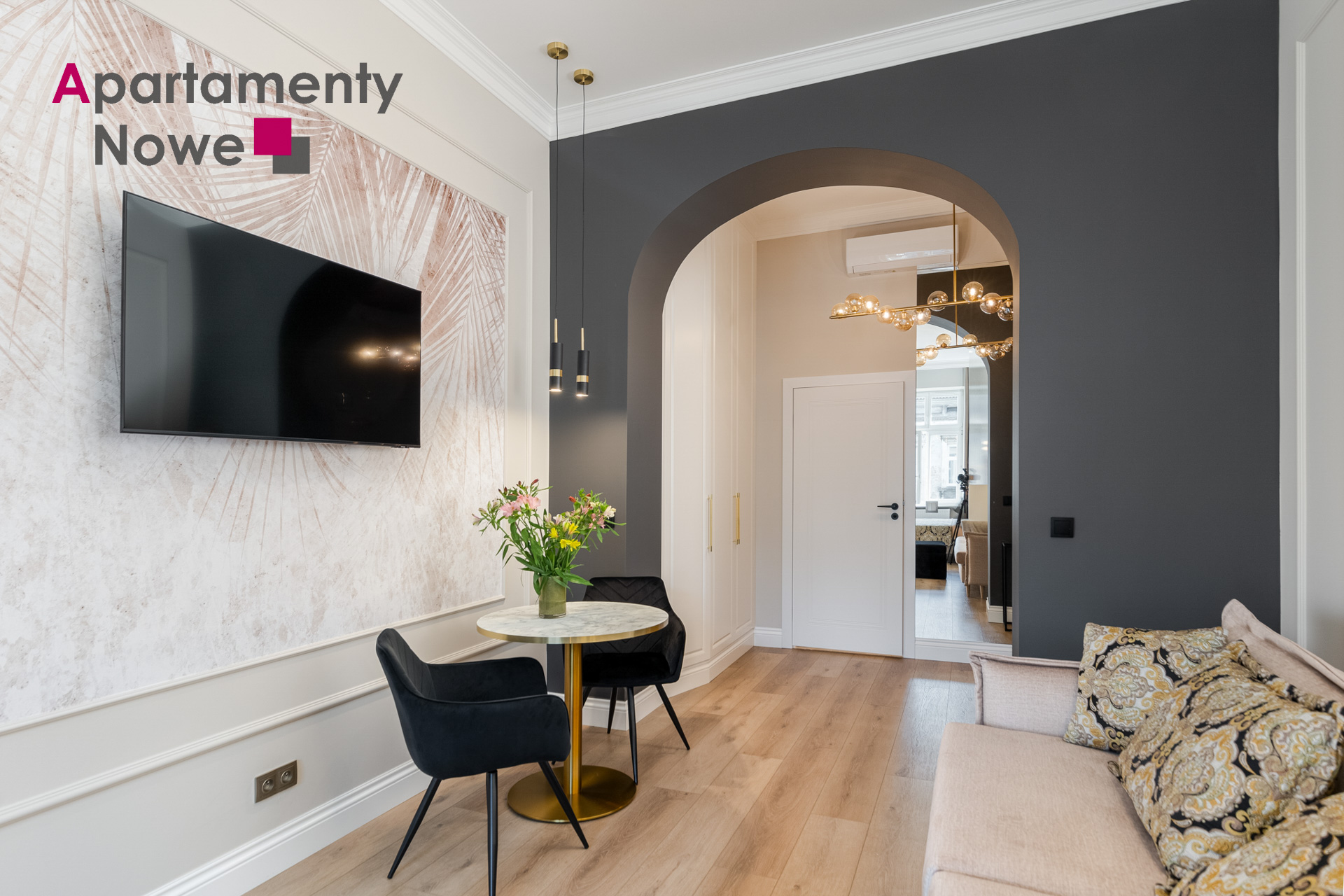The apartment has an area of 38 sqm, which consists of: elegant, bright living room with the sleeping area, which has a comfortable double bed, a wardrobe, is optically separated from the relaxation area by partial construction, separate kitchen, equipped with high quality appliances, necessary  for everyday use stylish bathroom with the shower and a spacious hall. The apartment is equipped with air conditioning. The interior impresses with its above-standard room height, which, combined with large windows, gives it exceptional class and elegance.