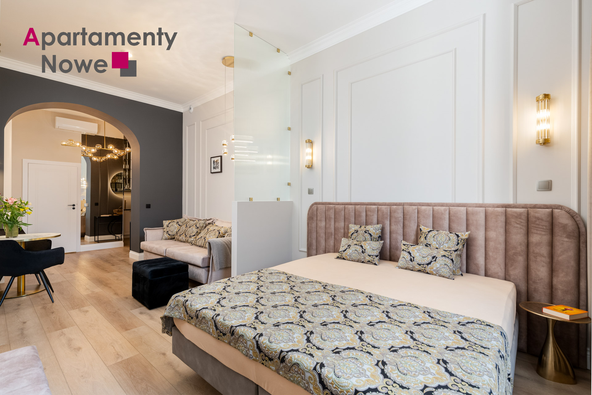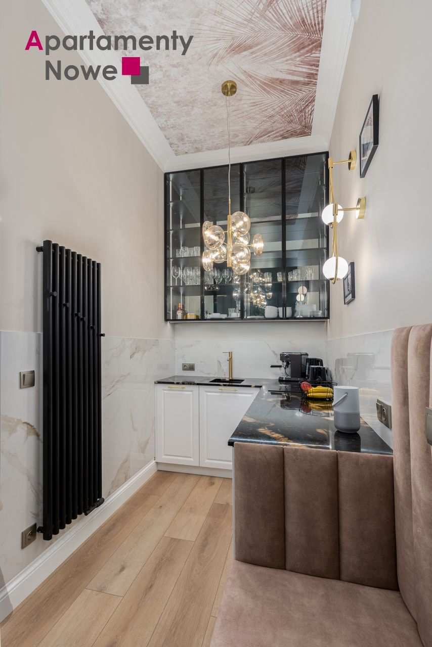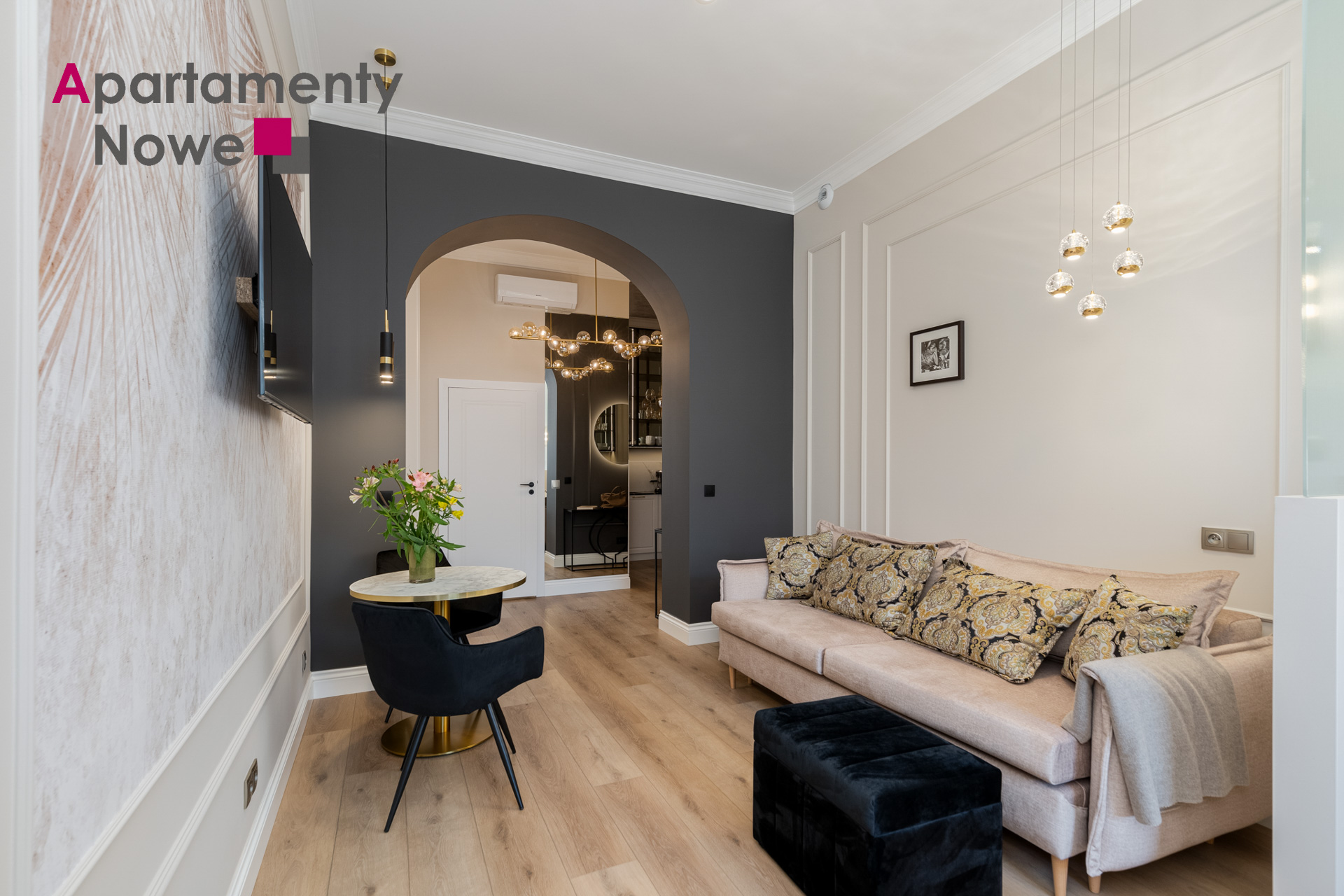 The apartment has an area of 38 sqm, which consists of: elegant, bright living room with the sleeping area, which has a comfortable double bed, a wardrobe, is optically separated from the relaxation area by partial construction, separate kitchen, equipped with high quality appliances, necessary  for everyday use stylish bathroom with the shower and a spacious hall. The apartment is equipped with air conditioning. The interior impresses with its above-standard room height, which, combined with large windows, gives it exceptional class and elegance.